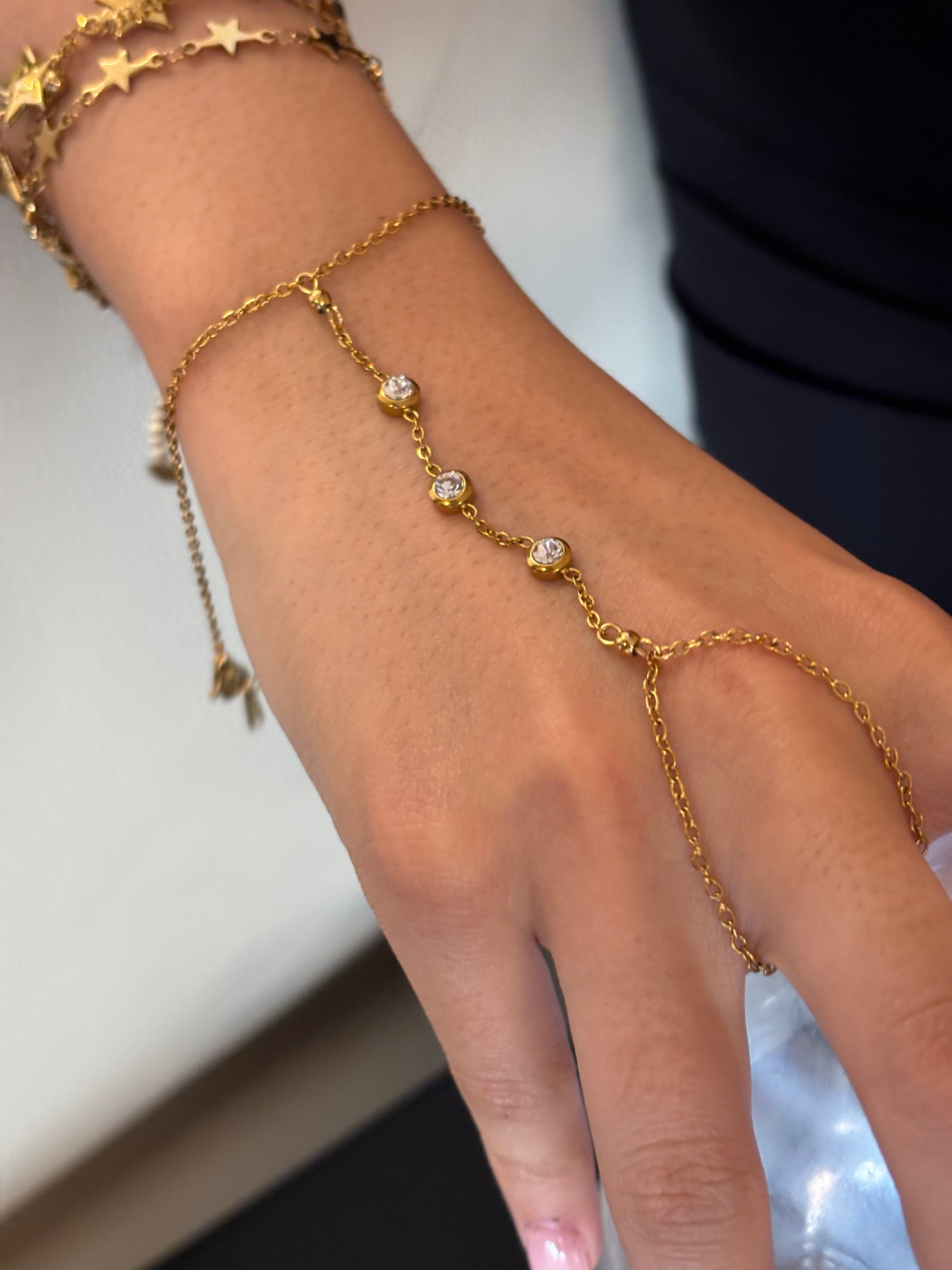 Mots clés : chaîne de main, bracelet attaché au doigt, doré, or, acier inoxydable, strass blanc, argent